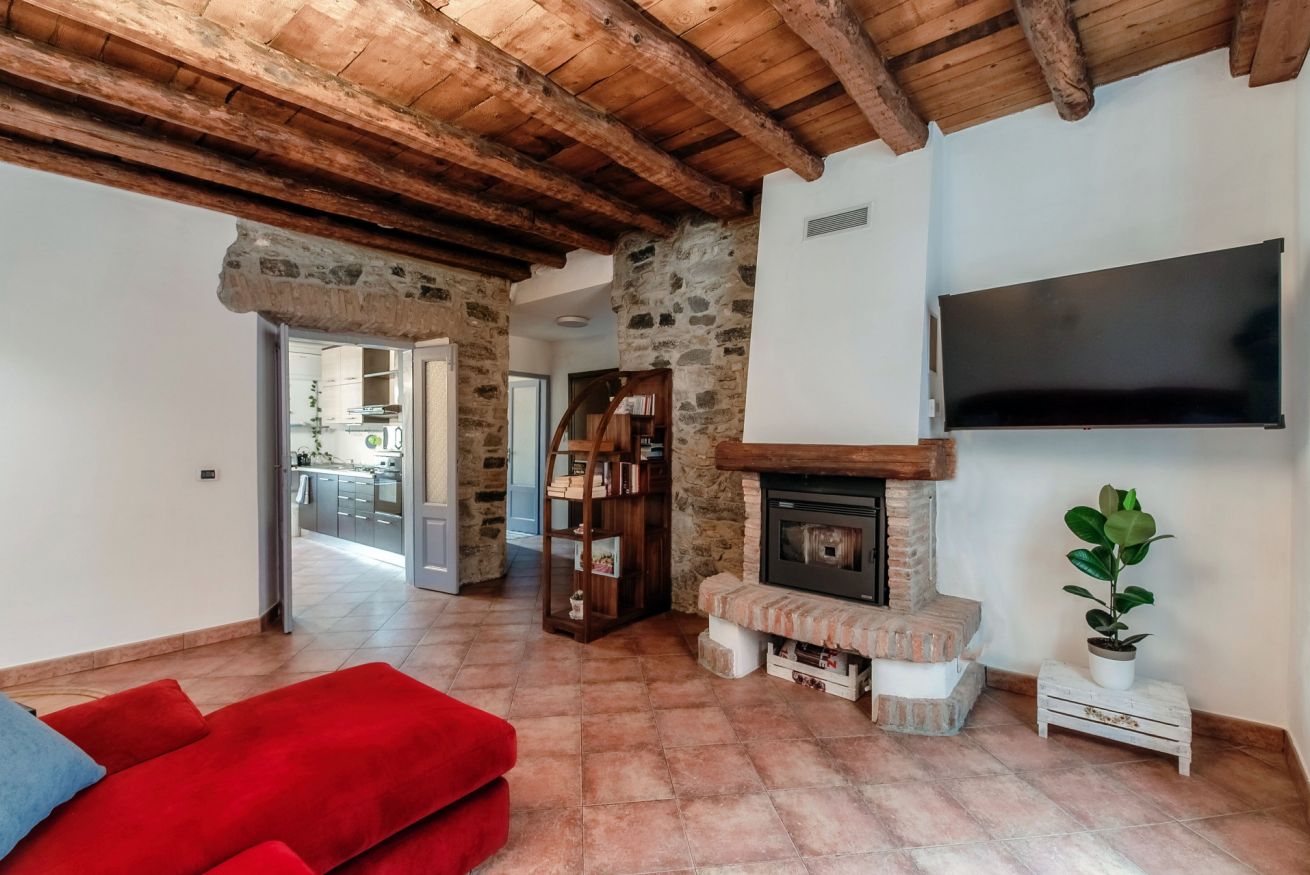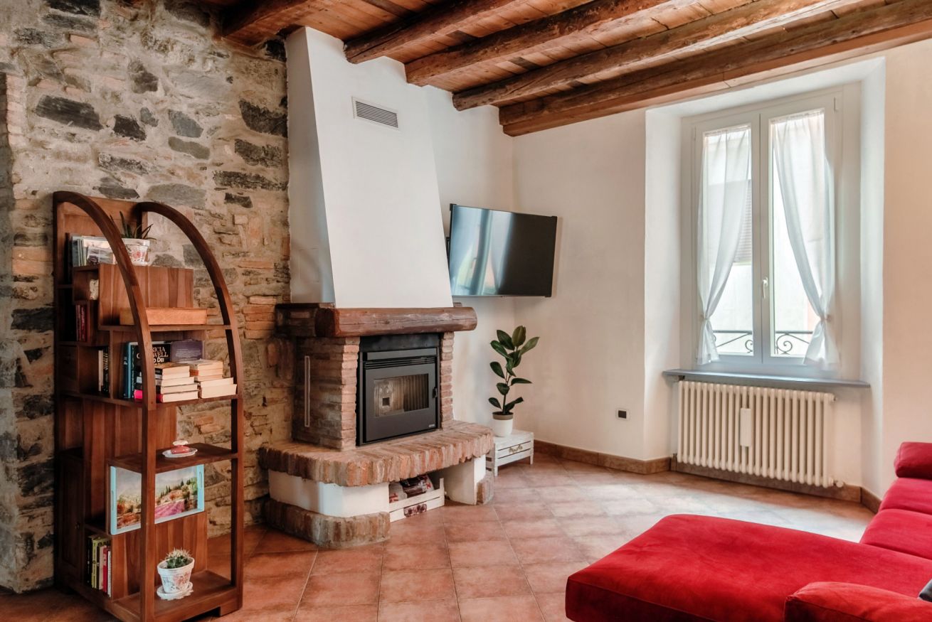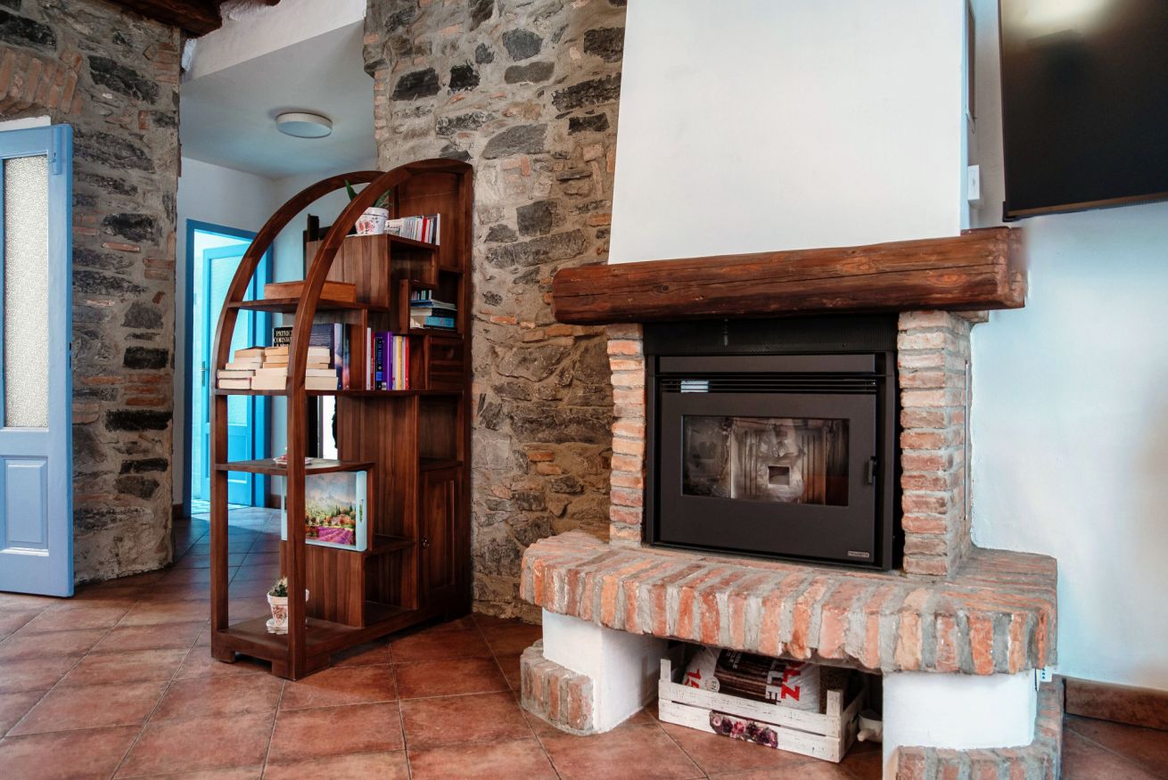 Soggiorno luminoso e molto accogliente con televisione, comodo divano e caminetto per creare la giusta atmosfera, magari mentre si sfoglia uno dei libri presenti nel mobile di fianco.