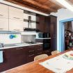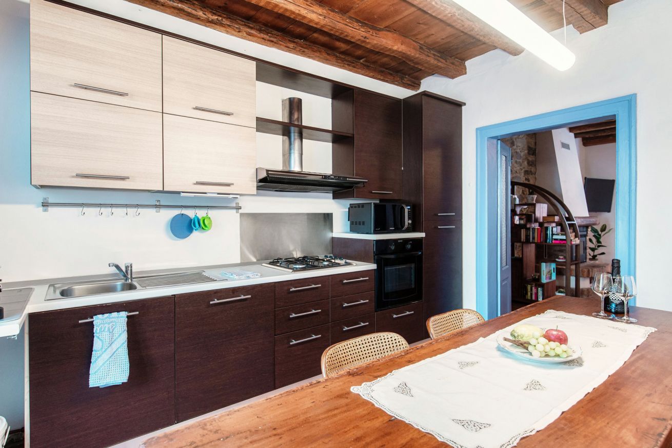 Cucina funzionale dotata di piano cottura con 4 fornelli, forno a microonde, forno elettrico, macchina del caffè, tostapane, frigorifero e un ampio tavolo da pranzo per mangiare in compagnia.