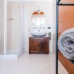 Un bagno moderno e funzionale, preceduto da un pratico antibagno, dotato di box doccia, set di cortesia e asciugamani freschi.