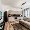 Cucina a vista completamente attrezzata, fornita di angolo cottura, lavastoviglie, macchina del caffè e stoviglie.
