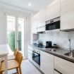 Cucina a vista completamente attrezzata, fornita di angolo cottura, lavastoviglie, macchina del caffè e stoviglie.