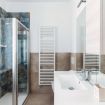 Un bagno moderno e funzionale, preceduto da un pratico antibagno, dotato di box doccia, set di cortesia e asciugamani freschi.