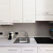 Cucina a vista completamente attrezzata, fornita di angolo cottura, lavastoviglie, macchina del caffè e stoviglie.