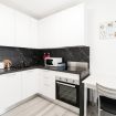 Cucina a vista completamente attrezzata, fornita di angolo cottura, lavastoviglie, macchina del caffè e stoviglie.