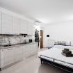 Cucina a vista completamente attrezzata, fornita di angolo cottura, lavastoviglie, macchina del caffè e stoviglie.
