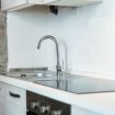 Cucina a vista completamente attrezzata, fornita di angolo cottura, lavastoviglie, macchina del caffè e stoviglie.