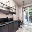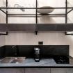 Cucina all'avanguardia completa di piano ad induzione, macchinetta del caffè, frigorifero, congelatore e lavastoviglie con posate e bicchieri.