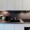 Cucina a vista completamente attrezzata, fornita di angolo cottura, lavastoviglie, macchina del caffè e stoviglie.