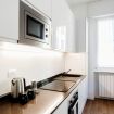 Cucina completamente attrezzata, fornita di angolo cottura, lavastoviglie, macchina del caffè e stoviglie.